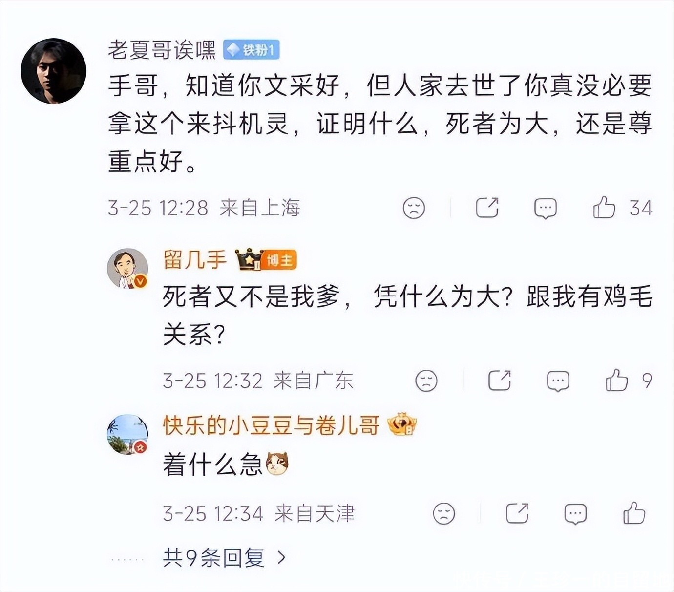 留几手的发文和回复彻底惹怒了网友,大家认为他“为流量突破道德底线”“消费逝者”“冷漠无情”。