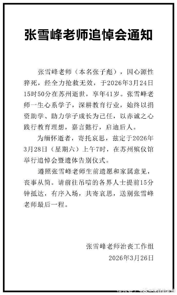 根据通知可知,张雪峰的追悼会将于3月28日在苏州殡仪馆举行。